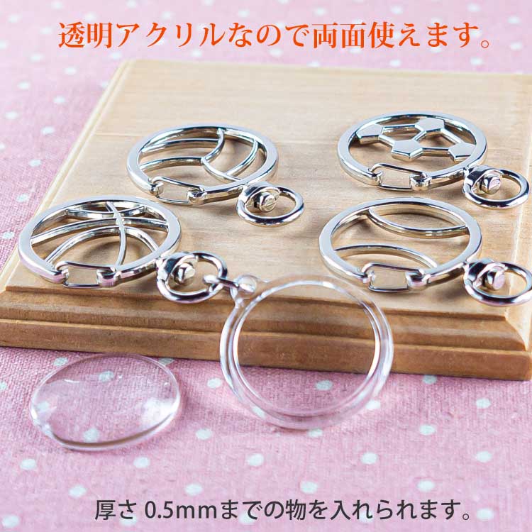 透明アクリル製ハメパチ型キーホルダー丸型25は、裏表に違うデザインの原稿を入れられて(厚さ0.5mmまでの物)押し花もOKで、簡単に楽しいキーホルダーが手作り出来るパーツです。 パーツは1個から大口ロットまで販売いたしてますので販促品、記念品、プレゼント、ノベルティなど多用に合わせてオリジナルの丸型25キーホルダーが作れます。丸型25mmはクラフトパンチ対応商品なので原稿を簡単にカットできます。