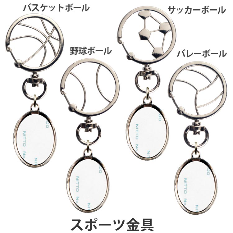 卒団記念品やスポーツ応援グッズに野球ボール、サッカーボール、バレーボール、バスケットボールの金具付だ円21x28キーホルダーを製作できる手作りパーツです。