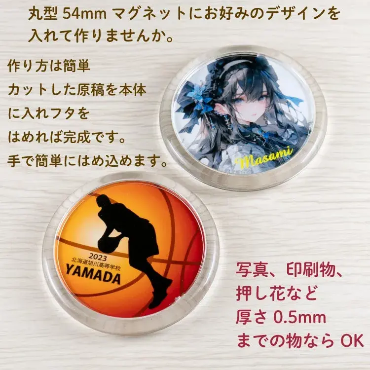 ハメパチ・マグネットは写真やイラスト、印刷物などお好みのデザインを本体入れフタをはめ込むだけで簡単に作ることができます。